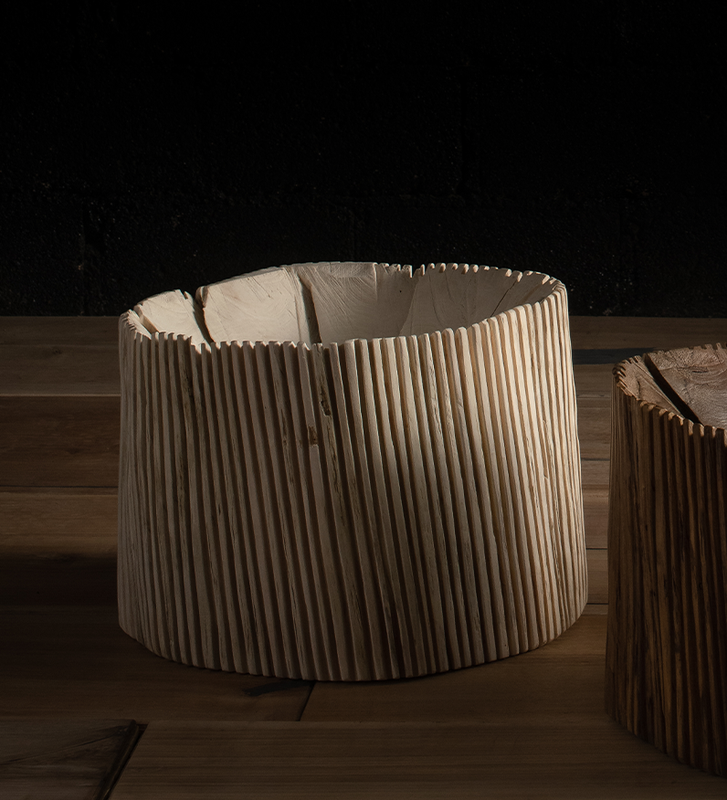 Bowl decorativo con ranuras verticales hecho a mano por artesanos mexicanos, de madera recuperada.