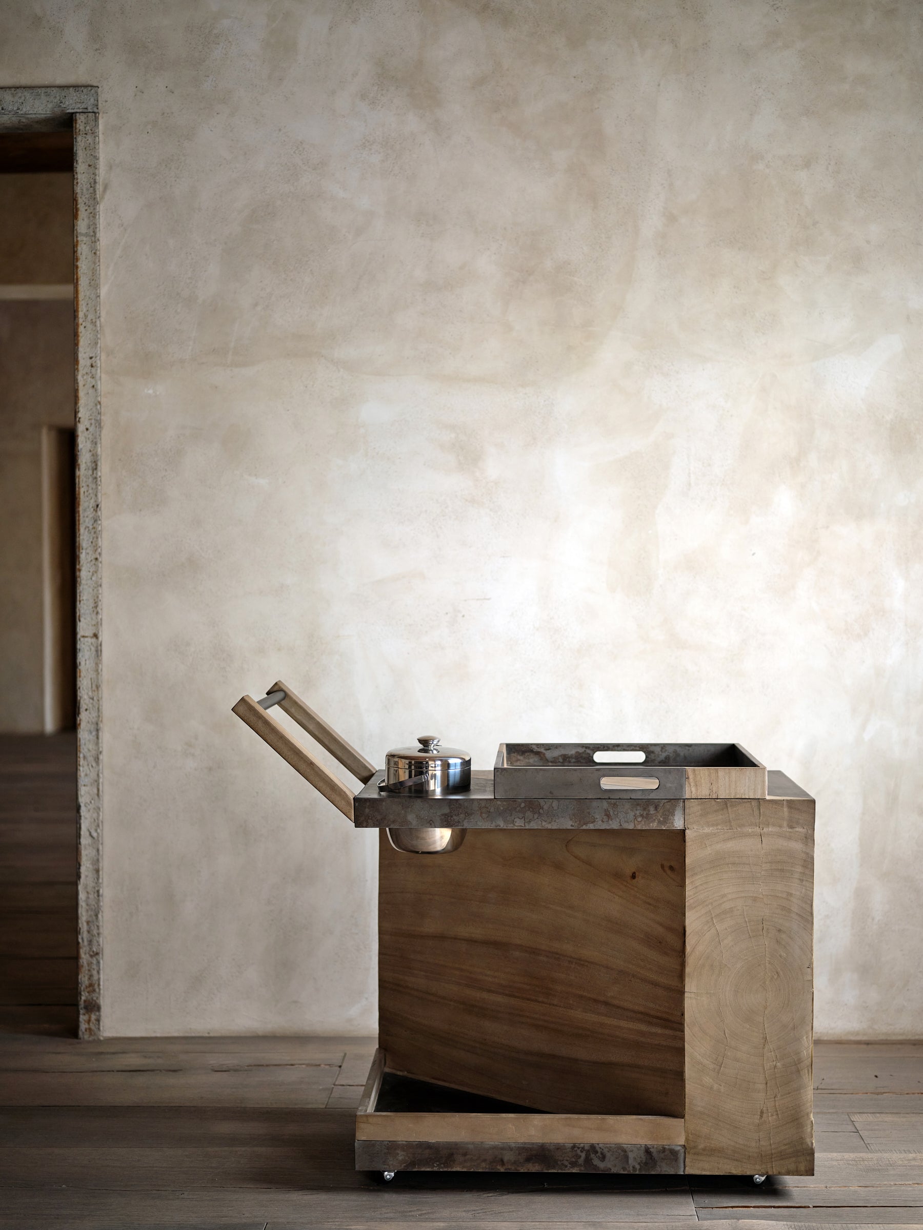 Hecho de guanacaste premium, este carrito resalta la belleza natural de la madera, garantizando durabilidad y un encanto único en cada detalle. El metal envejecido complementa a la perfección con un toque industrial, asegurando que este carrito no pase desapercibido en ningún ambiente.