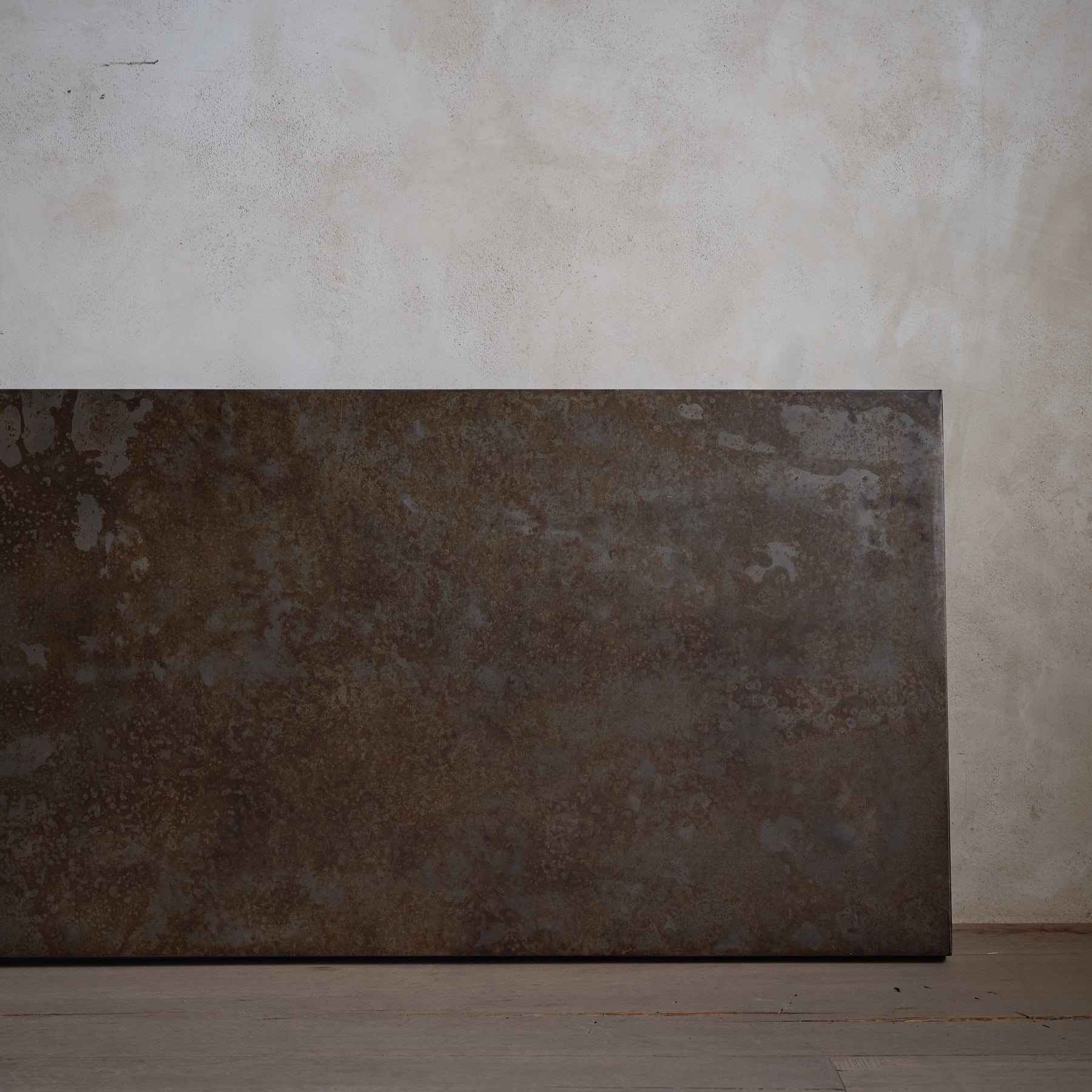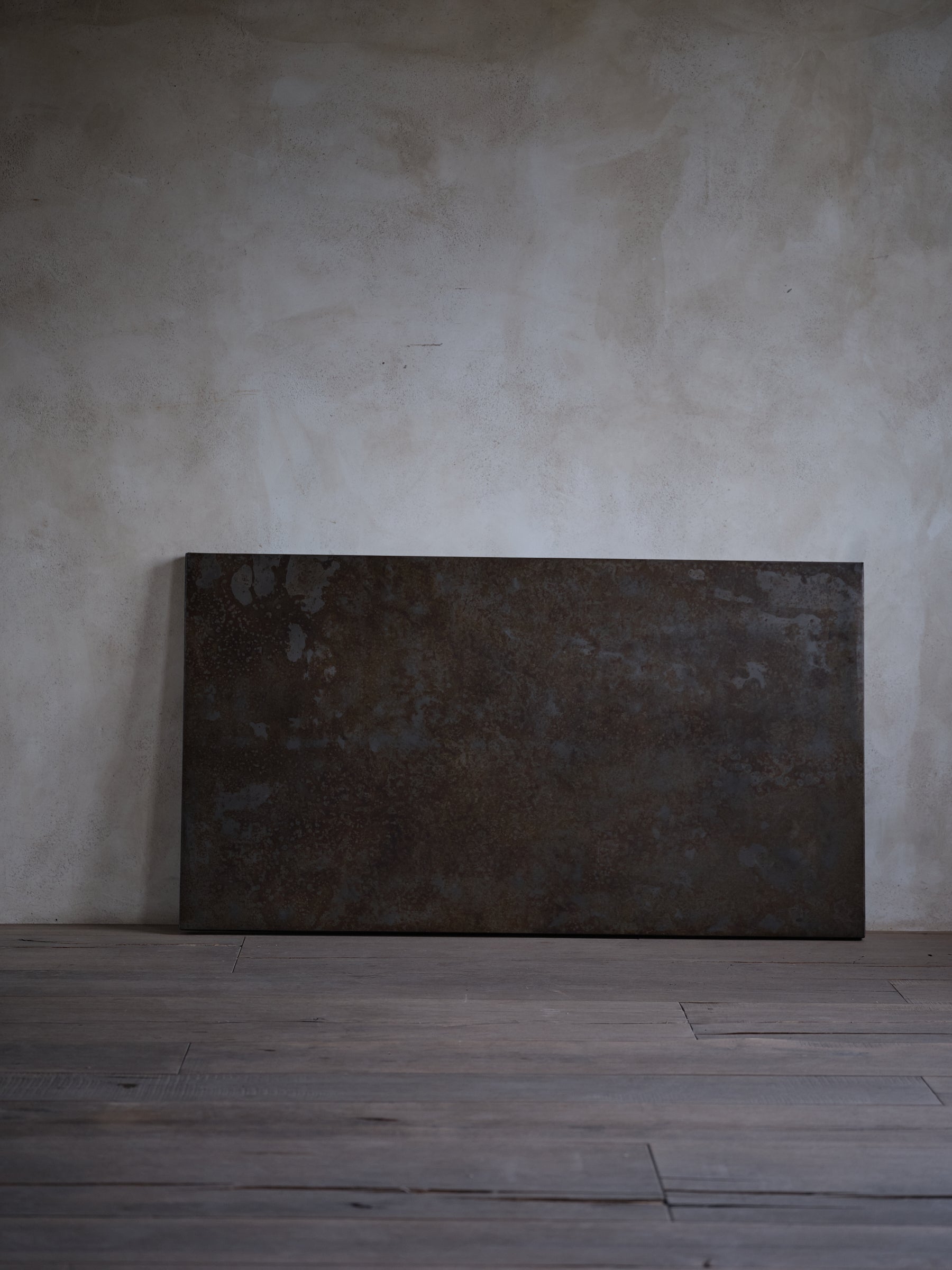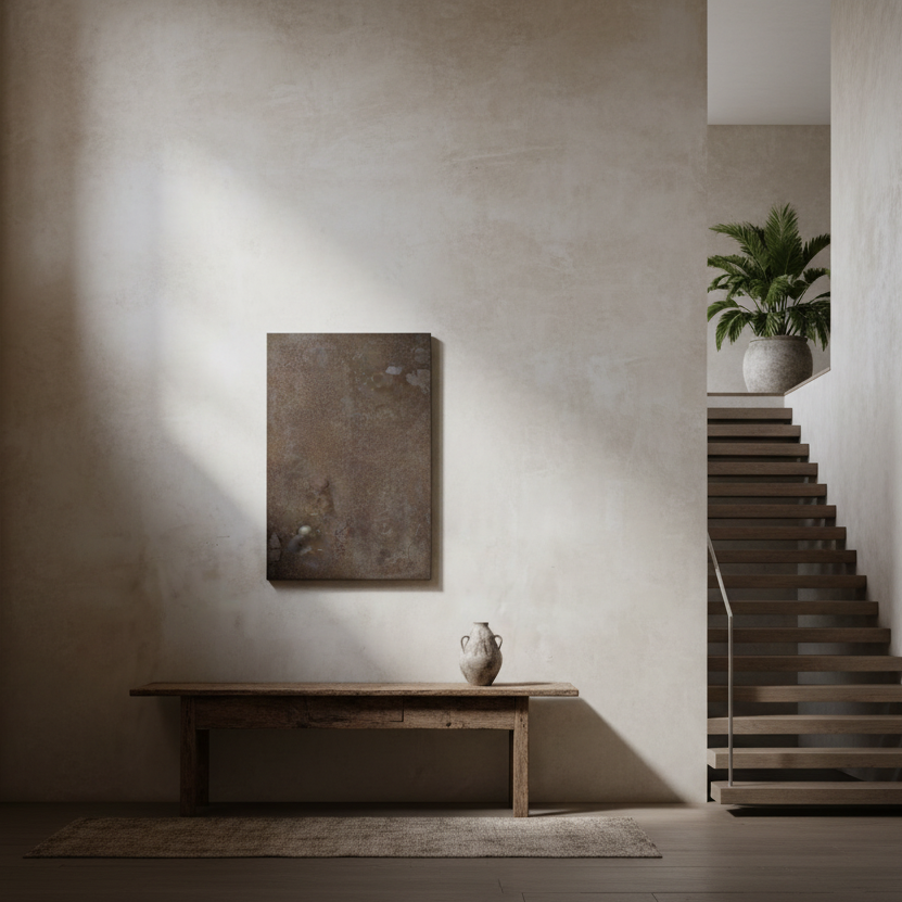 Arte de pared Van: pieza terminada mediante un proceso artesanal de oxidación que se prolonga durante varios meses, en el que cada etapa se supervisa y se trabaja a mano. A medida que el metal reacciona, surgen vetas, texturas y matices de color que no pueden reproducirse de forma exacta, por lo que cada cuadro adquiere una personalidad propia. El resultado es una obra robusta y elegante, ideal para realzar cualquier espacio con un carácter industrial y orgánico a la vez. Se entrega lista para colgar y requiere cuidados sencillos para preservar su pátina natural.