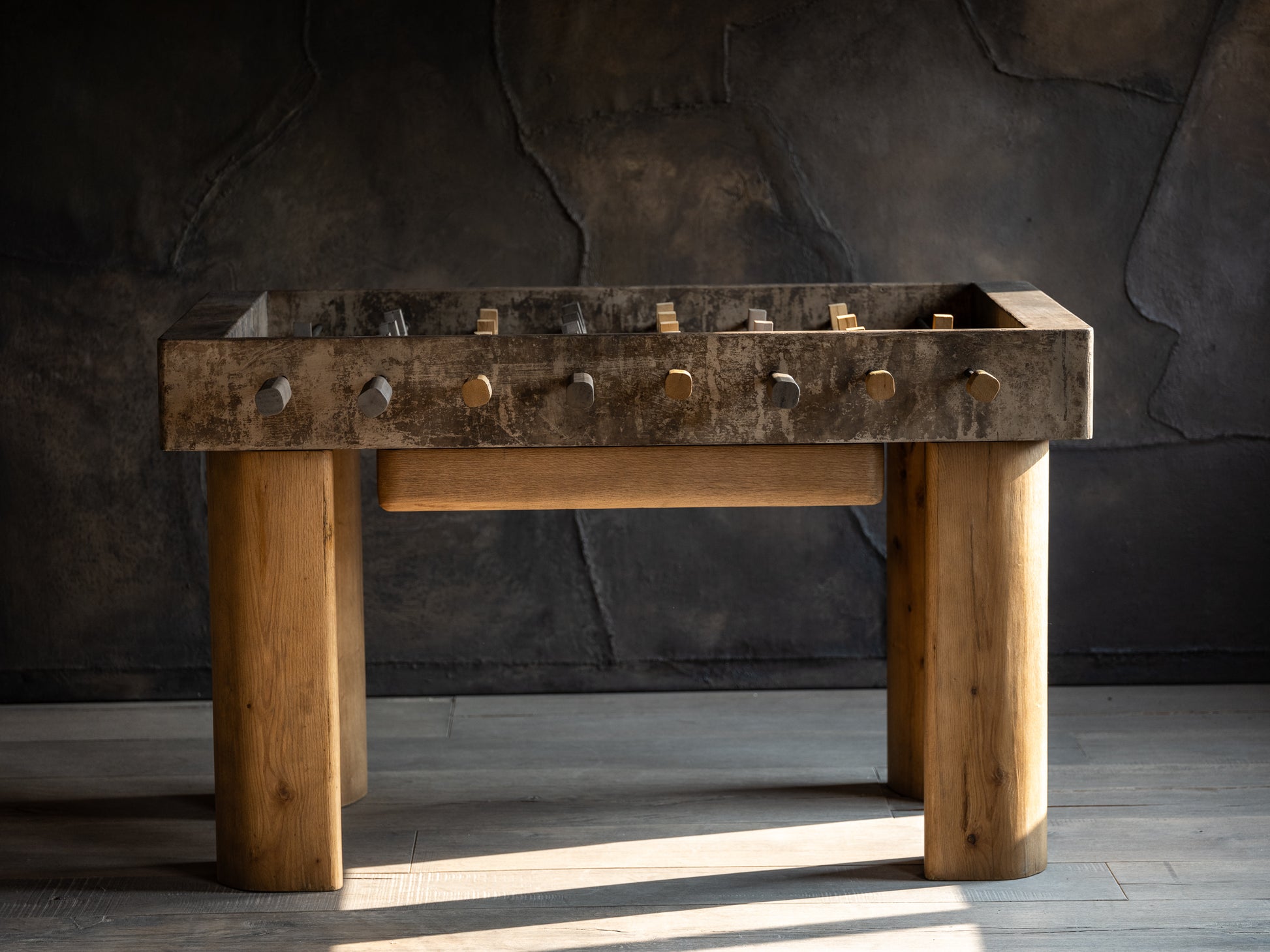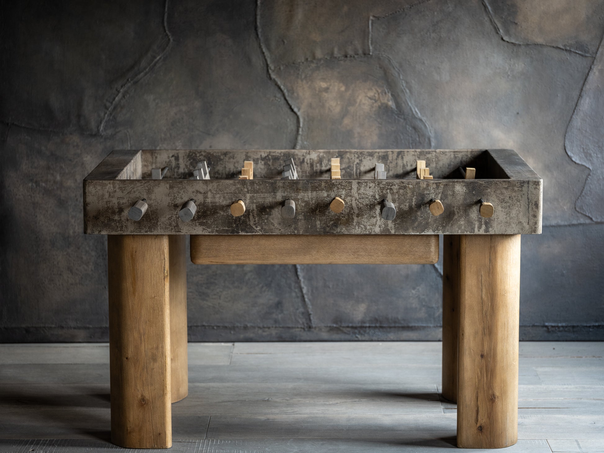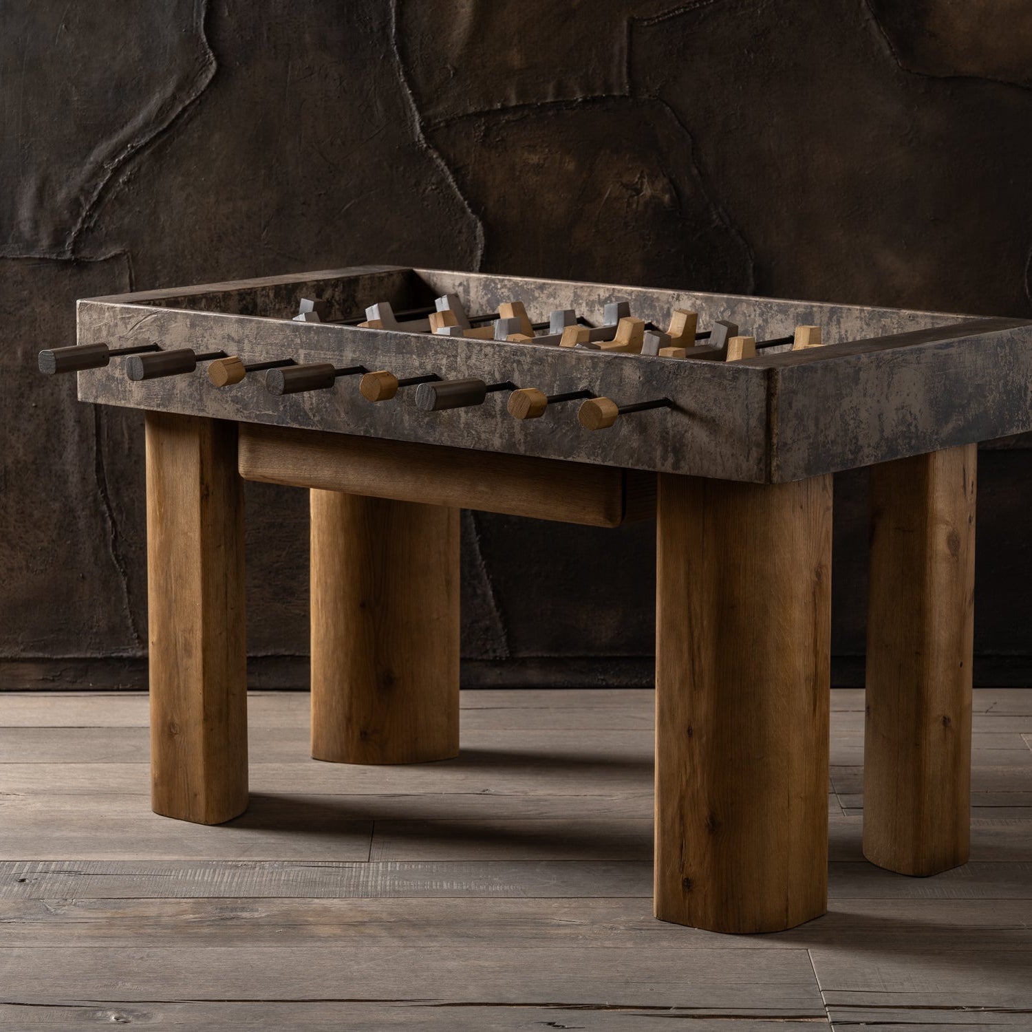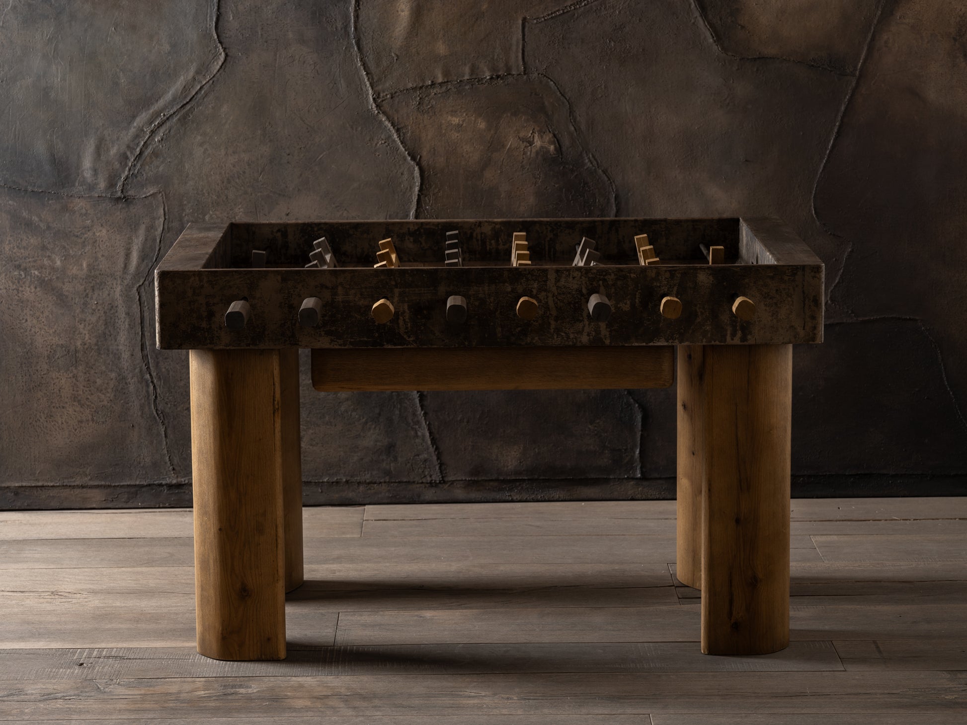 Hecha a mano para realzar cualquier espacio y reunir a familiares y amigos, nuestra mesa de futbolito de madera recuperada equilibra perfectamente la belleza y la funcionalidad. Inspirada en los detalles naturales de la madera recuperada—proveniente de árboles caídos por desastres naturales o cortados para dar paso a construcciones—artesanos mexicanos complementan las superficies de madera de yuca y los jugadores de malacate en color ocre con acero y aluminio en acabados oxidantes.