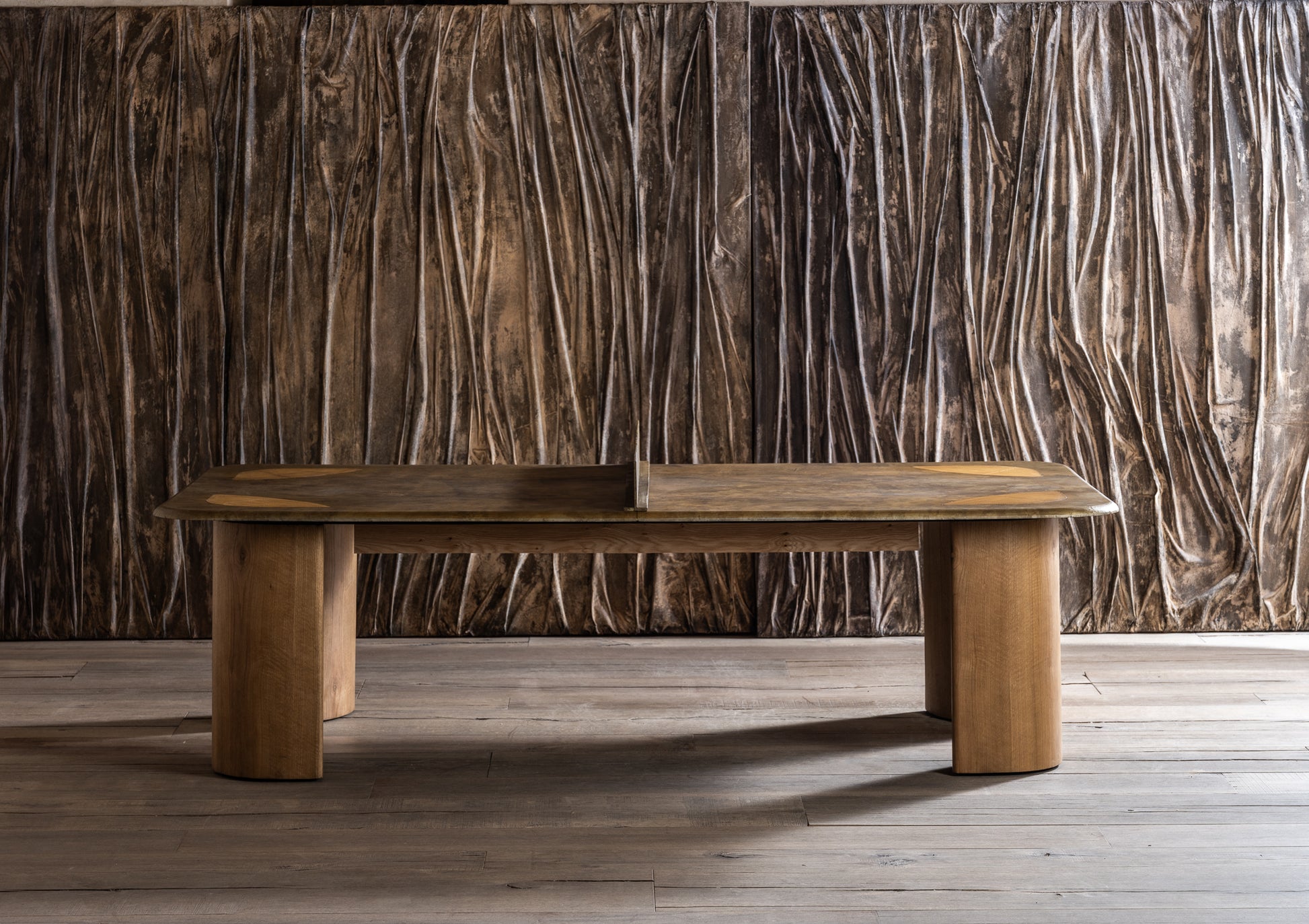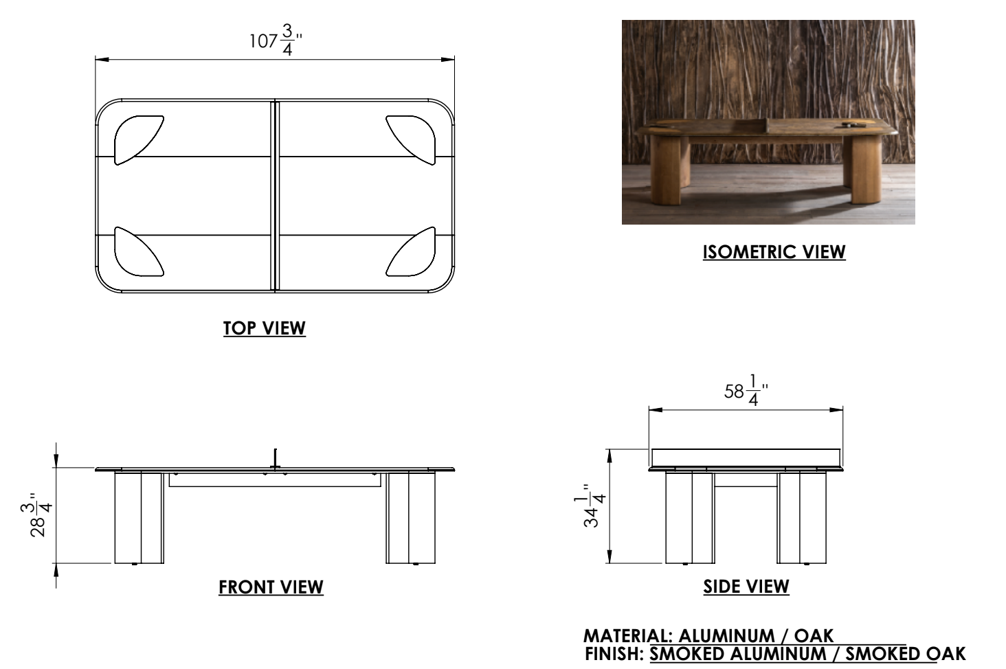 Esta mesa es una obra maestra de diseño y funcionalidad, concebida para ser el corazón vibrante de cualquier hogar. Sus robustas patas de roble ahumado y la elegante superficie combinada de aluminio y roble, con un distintivo acabado ahumado, crean una estética sofisticada que trasciende lo meramente utilitario.
